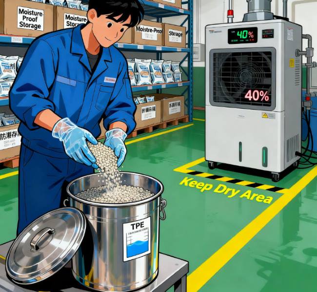 ໃນຖານະເປັນວັດສະດຸໂພລີເມີ, ວັດຖຸດິບ TPE ມີຄວາມອ່ອນໄຫວສູງຕໍ່ຄວາມຊຸ່ມຊື່ນຂອງສິ່ງແວດລ້ອມ. ພວກມັນດູດຊຶມຄວາມຊຸ່ມຊື່ນຈາກອາກາດໄດ້ດີໃນລະຫວ່າງການເກັບຮັກສາຫຼືການຂົນສົ່ງ, ນໍາໄປສູ່ຄຸນສົມບັດຂອງວັດສະດຸທີ່ຊຸດໂຊມ, ຄວາມຫຍຸ້ງຍາກໃນການປຸງແຕ່ງ, ແລະແມ້ກະທັ້ງການທໍາລາຍຄຸນນະພາບຜະລິດຕະພັນສຸດທ້າຍ. ການ​ຄຸ້ມ​ຄອງ​ຄວາມ​ຊຸ່ມ​ຊື່ນ​ທີ່​ມີ​ປະ​ສິດ​ທິ​ຜົນ​ສໍາ​ລັບ​ອຸ​ປະ​ກອນ TPE ຮຽກ​ຮ້ອງ​ໃຫ້​ມີ​ວິ​ທີ​ການ​ຫຼາຍ​ດ້ານ​ປະ​ກອບ​ມີ​ການ​ຄວບ​ຄຸມ​ສະ​ພາບ​ແວດ​ລ້ອມ​ການ​ເກັບ​ຮັກ​ສາ​, ວິ​ທີ​ການ​ຫຸ້ມ​ຫໍ່​ທີ່​ເຫມາະ​ສົມ​, ແລະ​ມາດ​ຕະ​ການ​ປ້ອງ​ກັນ​ເສີມ​.
